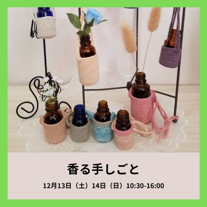 草木染めで編んだボトルカバーを纏ったアロマボトルの一輪挿しやアクセサリー、布小物、ハーブティー、お料理ハーブ、琥珀糖などを販売予定です。
