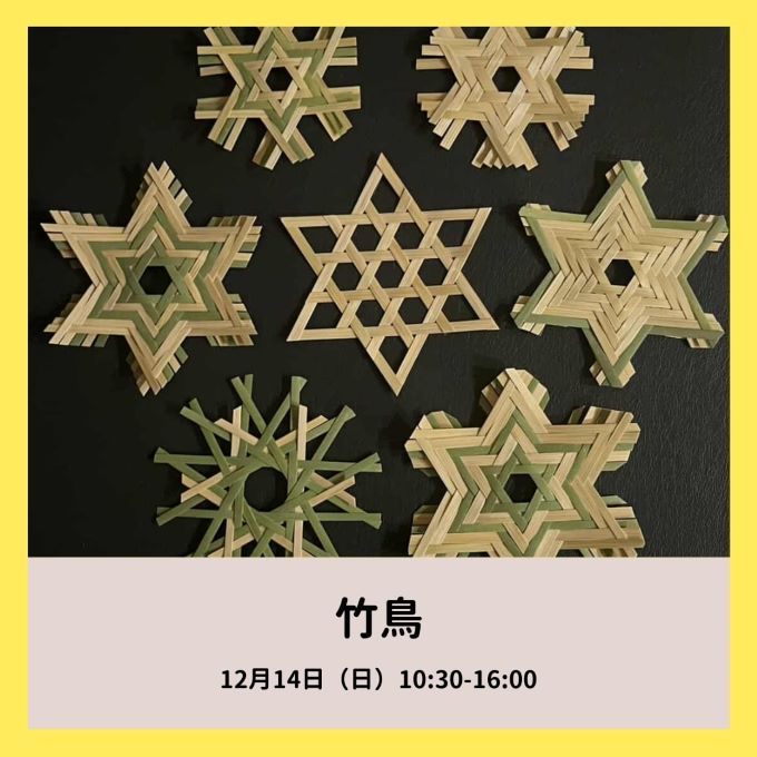 竹を用いたクリスマスオーナメントワークショップ、竹カゴなどの作品販売を予定しています。